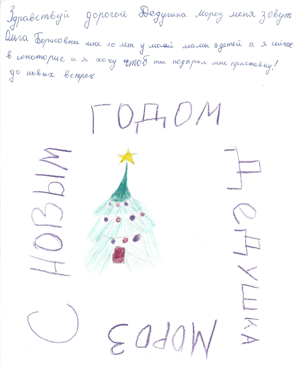 "Здравствуй дорогой Дедушка Мороз меня зовут Ольга Борисовна мне 10 лет у моей мамы 9 детей а я сейчас в соноторие и я хочу чтоб ты подарил мне приставку! До новых встреч С Новым годом Дедушка Мороз"