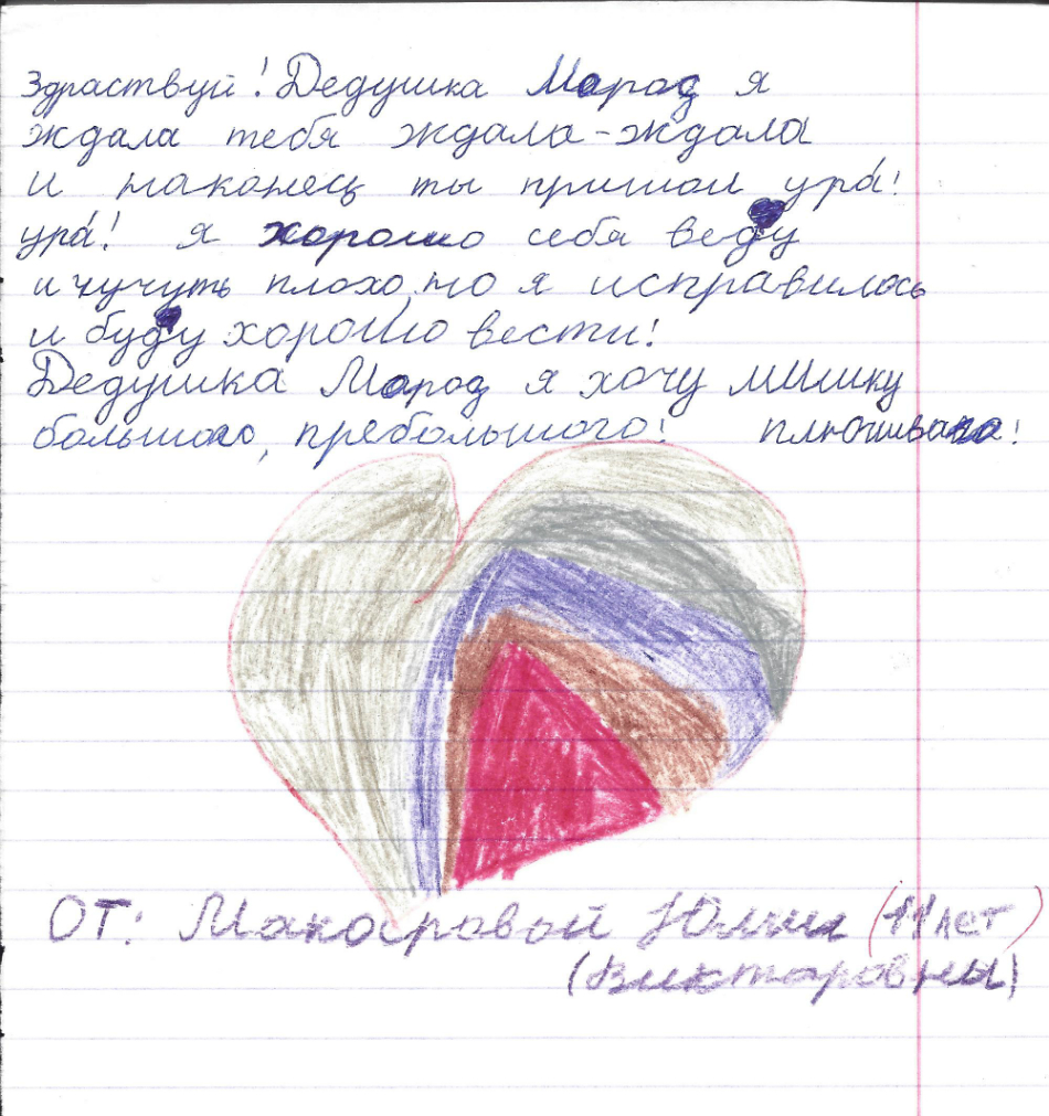 "Здравствуй! Дедушка Мороз я ждала тебя ждала-ждала и наконец ты пришол ура! Ура! Я хорошо себя веду и чучуть плохо, но я исправилось и буду хорошо вести! Дедушка Мороз я хочу мишку большого, пребольшого! Плюшеваго!"