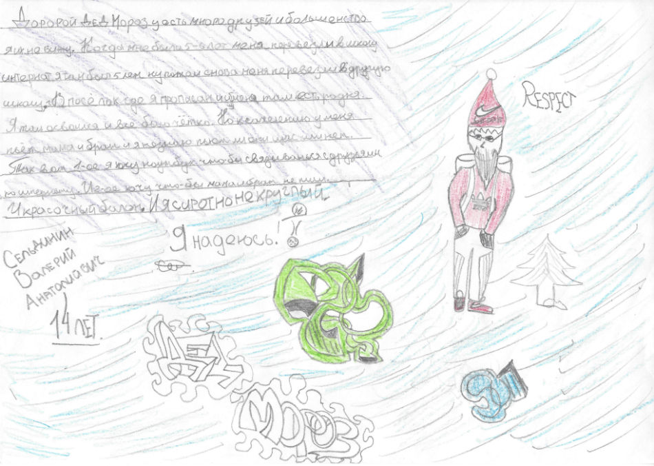 "Дорогой Дед Мороз у есть много друзей и большенство я их не вижу. Когда мне было 5-6 лет меня перевезли в школу интернат я там был 5 лет ну потом слова меня перевезли в другую школу. В поселок где я прописан и у меня там есть родня. Я там освоился и все было четко. Но к сажелению у меня пьет мама и брат и я не знаю пьют ли они щас или нет. Так вот 1-ое я хочу ноутбук чтобы связываться с друзьями по интернету. И 2-ое хочу чтобы мама и брат не пили.