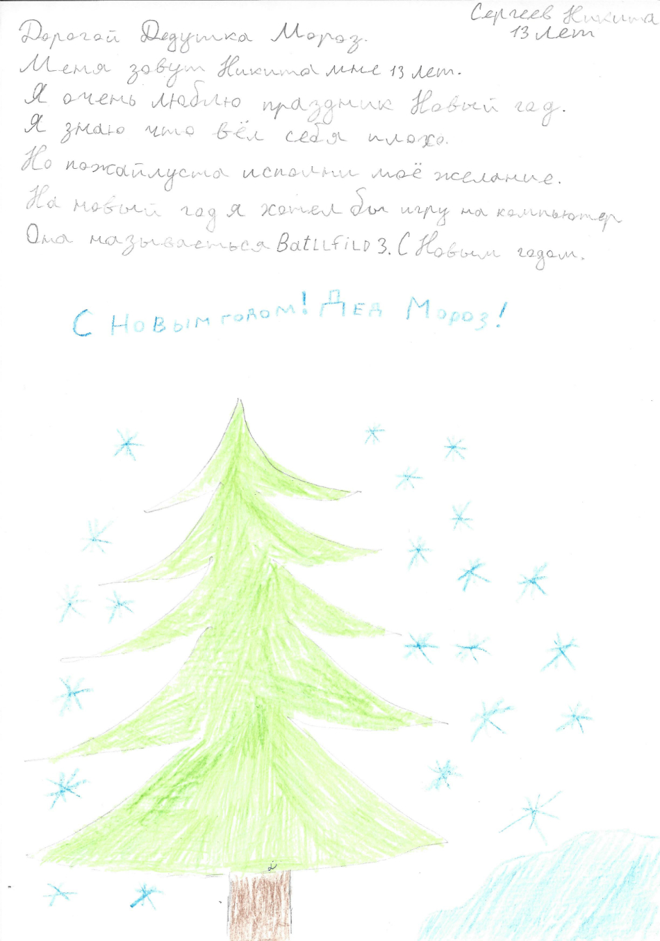 Меня зовут Никита мне 13 лет. Я очень люблю прозник Новый год. Я знаю что вёл себя плохо. Но пожалуйста исполни моё желание. На новый год я хотел бы игру на компьютер. Она называется Batllfild 3. С новым годом.