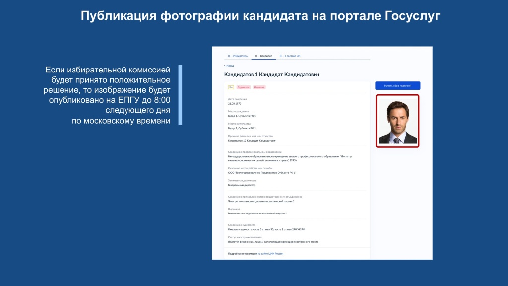 Эта фотография, наряду с фотографиями и информацией о других кандидатах, будет отображаться в личном кабинете избирателя в разделе «Выборы» на портале «Госуслуги».