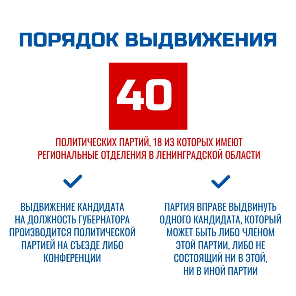 В соответствии с законодательством кандидатов на должность Губернатора Ленинградской области могут выдвигать политические партии, их региональные отделения. Решение о выдвижении кандидата принимается на съезде партии либо конференции (общем собрании) регионального отделения партии. Политическая партия вправе выдвинуть только одного кандидата, при этом такой кандидат может быть либо членом этой партии, либо не состоящий ни в этой, ни в иной партии. Политических партий, которые могут выдвигать кандидатов по данным Минюста России 40, из которых 18 имеют региональные отделении в Ленинградской области.