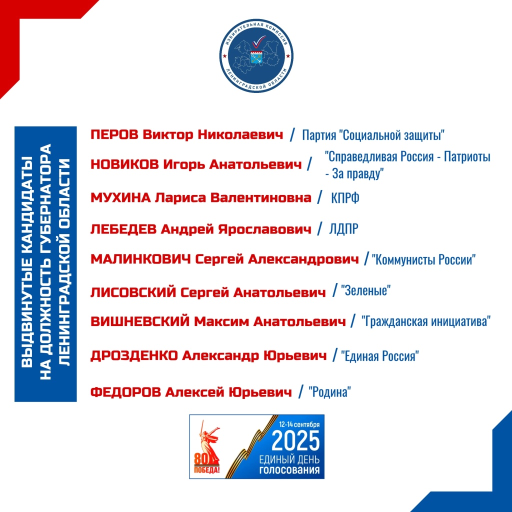 В ходе избирательной кампании по выборам Губернатора Ленинградской области 2 июля в 18 часов завершился этап выдвижения кандидатов. Выборы Губернатора Ленинградской области пройдут 12, 13 и 14 сентября 2025 года.