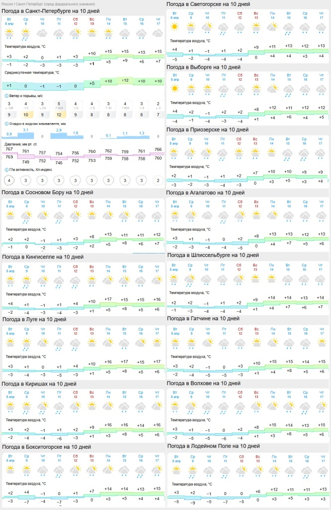 «Впереди вторая волна похолодания с пиком примерно на четверг, 10 апреля, который может остаться и с отрицательной средней температурой. Как и рассчитывали, с 9 на 10 апреля и с 10 на 11 апреля через регион проходят два циклона со снегом и похолоданием. Особенно некомфортно будет в пятницу, 11 апреля, из-за усиления ветра и снежно-дождевых осадков», – сообщает главный синоптик Санкт-Петербурга и Ленинградской области Александр Колесов.